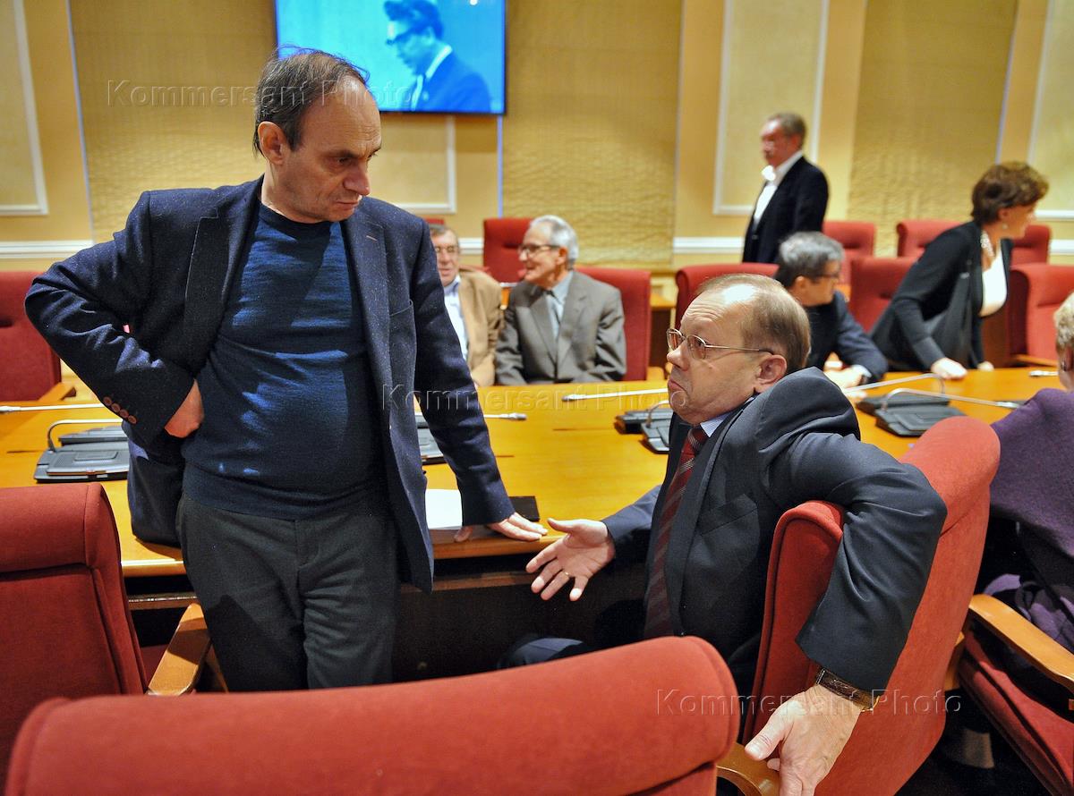 Chairman of the Russian Central Election Commission Vladimir Churov (left) during a meeting with the head of Federal Agency for Press and Mass Communications, National Union of bibliophiles president Mikhail Seslavinskiy (right) in the Literature Club, dedicated to the transfer archival materials of poet and journalist Alexei Surkov to the State Literary Museum Rospechat.