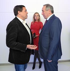 Генеральный директор канала РБК Александр Любимов (слева) и президент Федерации тенниса России Шамиль Тарпищев (справа) на торжественном приеме по случаю открытия эксклюзивного Boutique Jaguar Land Rover на Петровке.