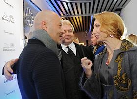 Слева направо: продюсер, режиссер Федор Бондарчюк, постановщик балетных спектаклей Андрис Лиепа, балерина Илза Лиепа на торжественном приеме по случаю открытия эксклюзивного Boutique Jaguar Land Rover на Петровке.
