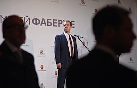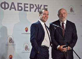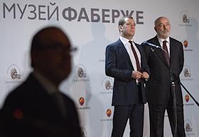 Председатель Правительства Дмитрий Медведев (слева) и председатель Наблюдательного комитета группы компаний "Ренова", председатель Попечительского совета Культурно-исторического фонда "Связь времен" Виктор Вексельберг (справа) во время посещения музея Фаберже в отреставрированном Шуваловском дворце Санкт-Петербурга.