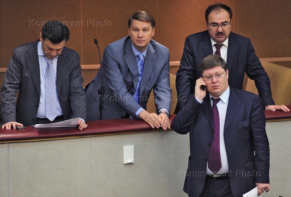 Полномочный представитель правительства России в Госдуме Александр Синенко (второй слева), председатель правления Пенсионного фонда России Антон Дроздов (справа), председатель комитета Государственной думы России по труду, социальной политике и делам ветеранов Андрей Исаев (второй справа) на пленарном заседании Госдумы России.