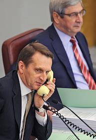 Председатель Государственной думы (ГД) России Сергей Нарышкин (слева) и первый заместитель председателя ГД России Иван Мельников на пленарном заседании Госдумы.