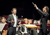 Немецкоий оперный певец Йонас Кауфман (слева) во время) выступления с государственным академическим симфоническим оркестром России имени Е.Ф.Светланова под управлением Йохена Ридера (справа) во время концерта в концертном зале "Барвиха Luxury Villge".