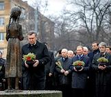 Мероприятия, посвященные 80-й годовщине Голодомора 1932-1933 годов. Президент Укранины Виктор Янукович (слева), бывший президент Украины Леонид Кучма (второй справа) и бывший президент Украины, лидер партии "Наша Украина" (НУ) Виктор Ющенко (справа) во время траурной церемонии возле Мемориала памяти жертв голодомора в парке Славы.