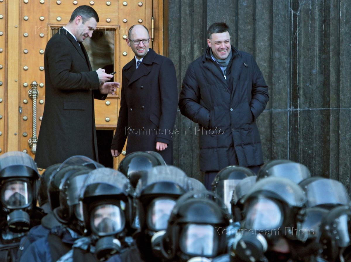 Лидер фракции Политической партии "УДАР (Украинский Демократический Альянс за Реформы) Виталия Кличко" Виталий Кличко (слева) и лидер фракции Всеукраинского объединения "Батькивщина" Арсений Яценюк (в центре) и лидер фракции ВО "Свобода" Олег Тягнибок (справа) возле здания Кабинета министров Украины после неудачной попытки лидеров оппозиции зайти на заседание правительства.