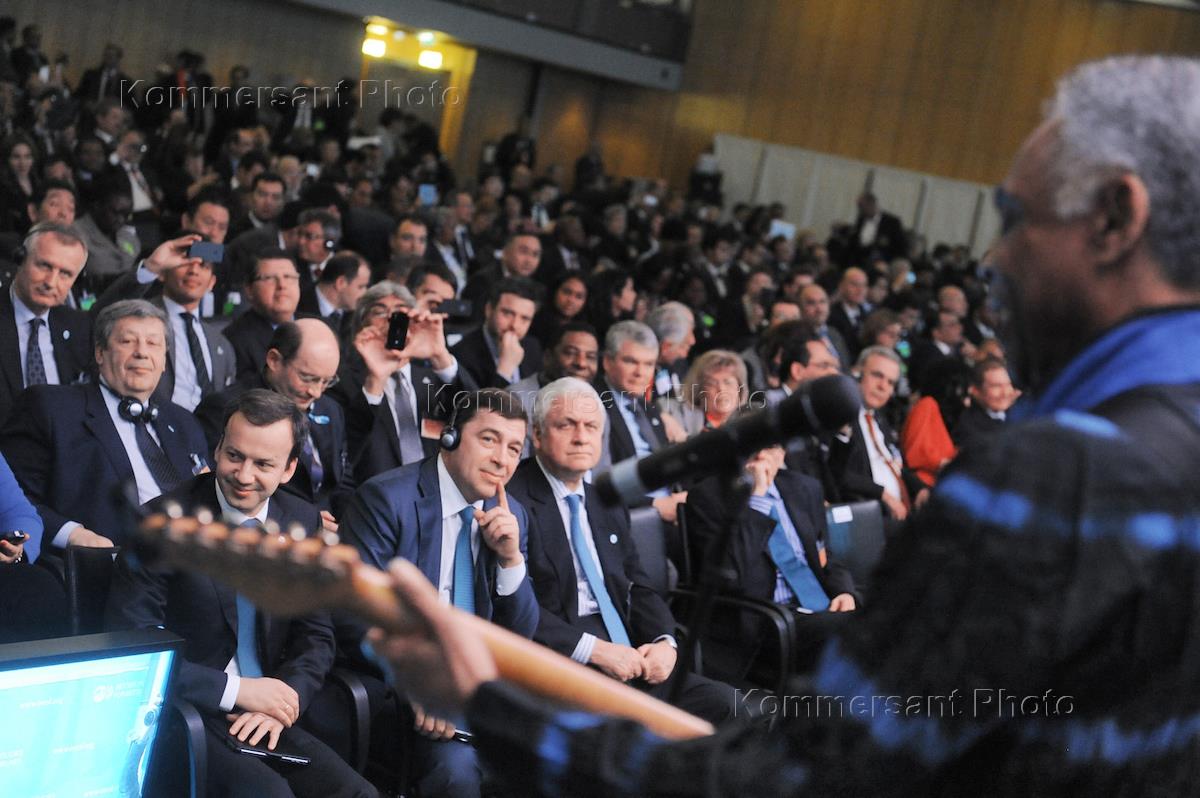 Заместитель председателя правительства России Аркадий Дворкович (в центре) и губернатор Свердловской области Евгений Куйвашев (второй справа) на ассамблее Международного бюро выставок (МБВ) в Конференц-центре Организации экономического сотрудничества и развития (ОЭСР). Третий этап голосования на право проведения Всемирной универсальной выставки ЭКСПО в 2020 году.