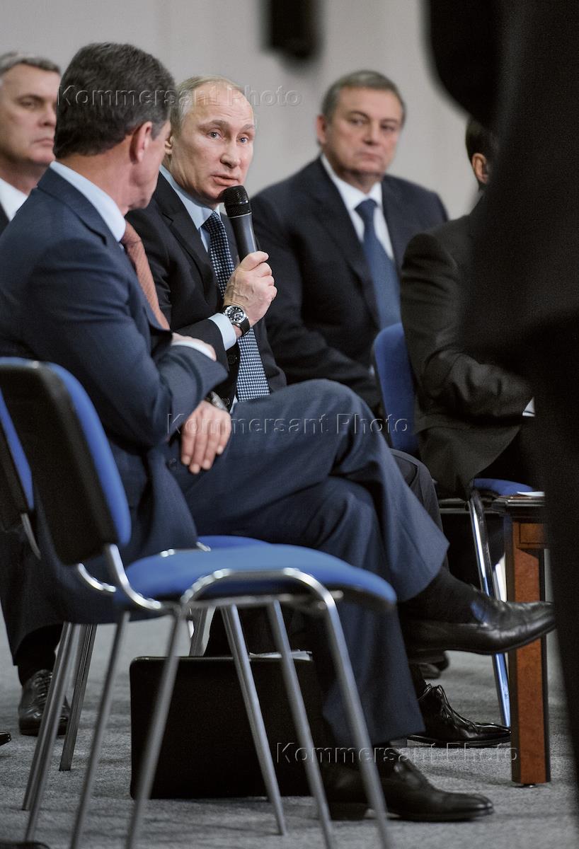 Президент России Владимир Путин (в центре) перед началом презентации завершающего этапа подготовки к Зимним олимпийским Играм в Сочи.