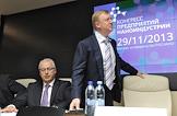 Заместитель генерального директора Государственной корпорации "Российская корпорация нанотехнологий" ( РОСНАНО ) Андрей Свинаренко (слева) и председатель Правления ОАО "РОСНАНО" Анатолий Чубайс (справа) на Втором конгрессе предприятий наноиндустрии в конференц-зале "Роснано".