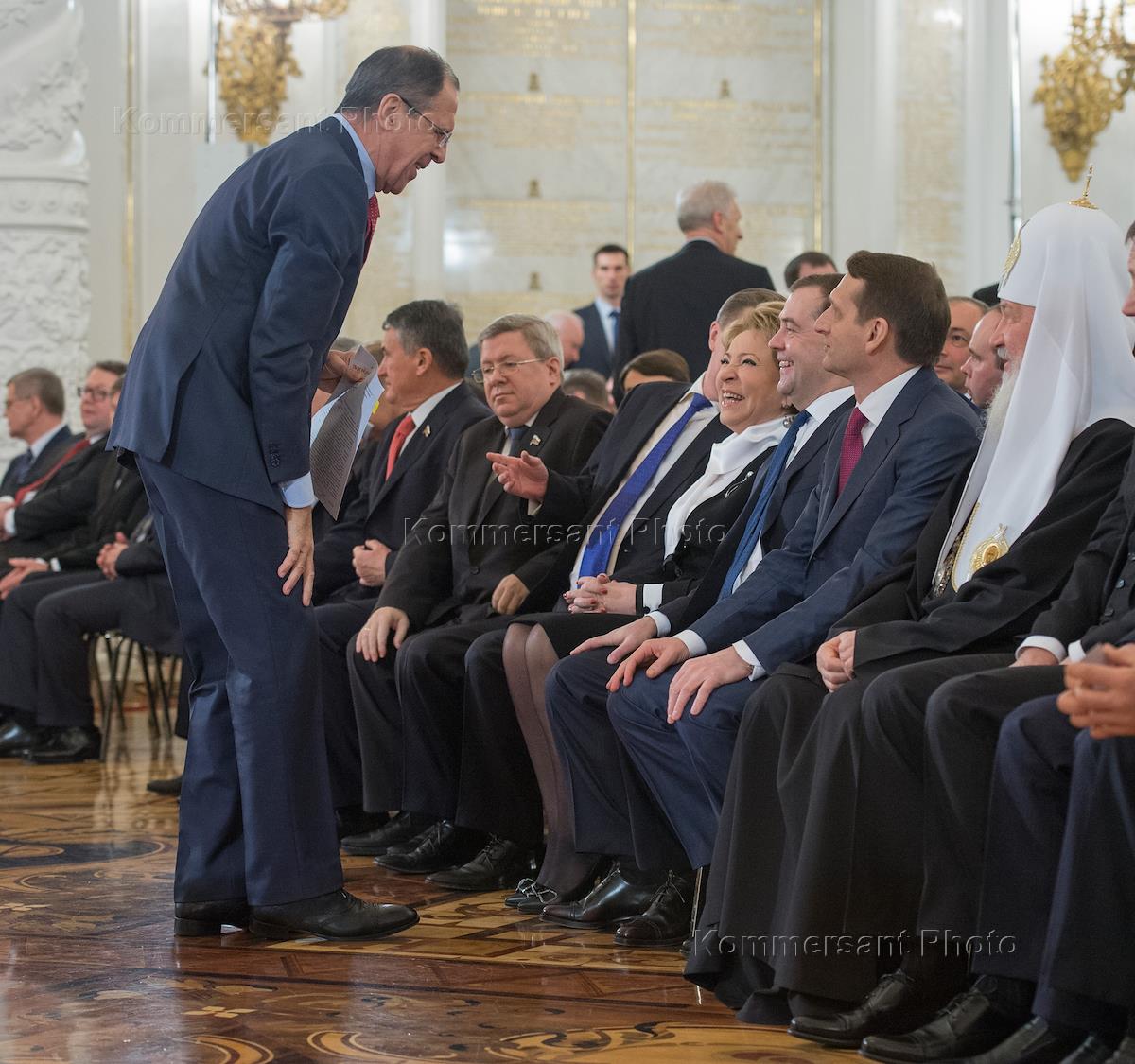 Министр иностранных дел России Сергей Лавров (стоит), первый заместитель председателя Совета Федерации России Александр Торшин (шестой справа), председатель Совета Федерации России Валентина Матвиенко (четвертая справа), председатель правительства России Дмитрий Медведев (третий справа), председатель Государственной думы России Сергей Нарышкин (второй справа) и Патриарх Московский и Всея Руси Кирилл (справа) во время Ежегодного Послания президента России Владимира Путина Федеральному Собранию Российской Федерации в Кремле.
