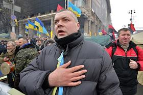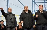 Евромайдан. Народные депутаты Верховной рады Украины: лидер фракции Всеукраинское объединение "Свобода" Олег Тягныбок (слева) и лидер фракции Политической партии "УДАР (Украинский Демократический Альянс за Реформы) Виталия Кличко" Виталий Кличко (справа) во время выступления на митинге сторонников евроинтеграции Украины на Майдане Незалежности (Площади Независимости).