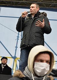 Евромайдан. Народный депутат Верховной рады Украины VII созыва, лидер фракции Политической партии "УДАР (Украинский Демократический Альянс за Реформы) Виталия Кличко" Виталий Кличко во время выступления на акции сторонников евроинтеграции Украины на площади Независимости.
