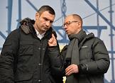 Евромайдан. Народный депутат Верховной рады Украины VII созыва, лидер фракции Политической партии "УДАР (Украинский Демократический Альянс за Реформы) Виталия Кличко" Виталий Кличко(слева) и народный депутат Верховной рады Украины VII созыва, лидер фракции Всеукраинского объединения "Батькивщина" Арсений Яценюк (справа) во время выступления на акции сторонников евроинтеграции Украины на площади Независимости.