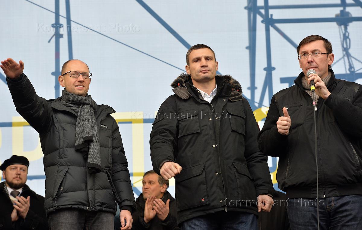 Евромайдан. Народный депутат Верховной рады Украины VII созыва, лидер фракции Всеукраинского объединения "Батькивщина" Арсений Яценюк(слева) и народный депутат Верховной рады Украины VII созыва, лидер фракции Политической партии "УДАР (Украинский Демократический Альянс за Реформы) Виталия Кличко" Виталий Кличко(в центре) во время выступления на акции сторонников евроинтеграции Украины на площади Независимости.