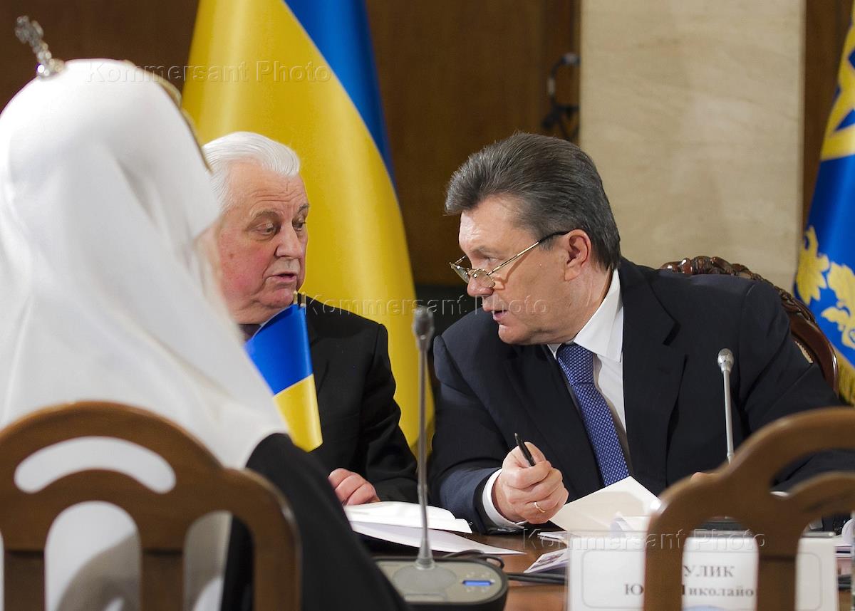 Первый президент Украины Леонид Кравчук (слева) и президент Украины Виктор Янукович (справа) на заседании Общенационального круглого стола "Объединим Украину". Заседание прошло во Дворце "Украина".