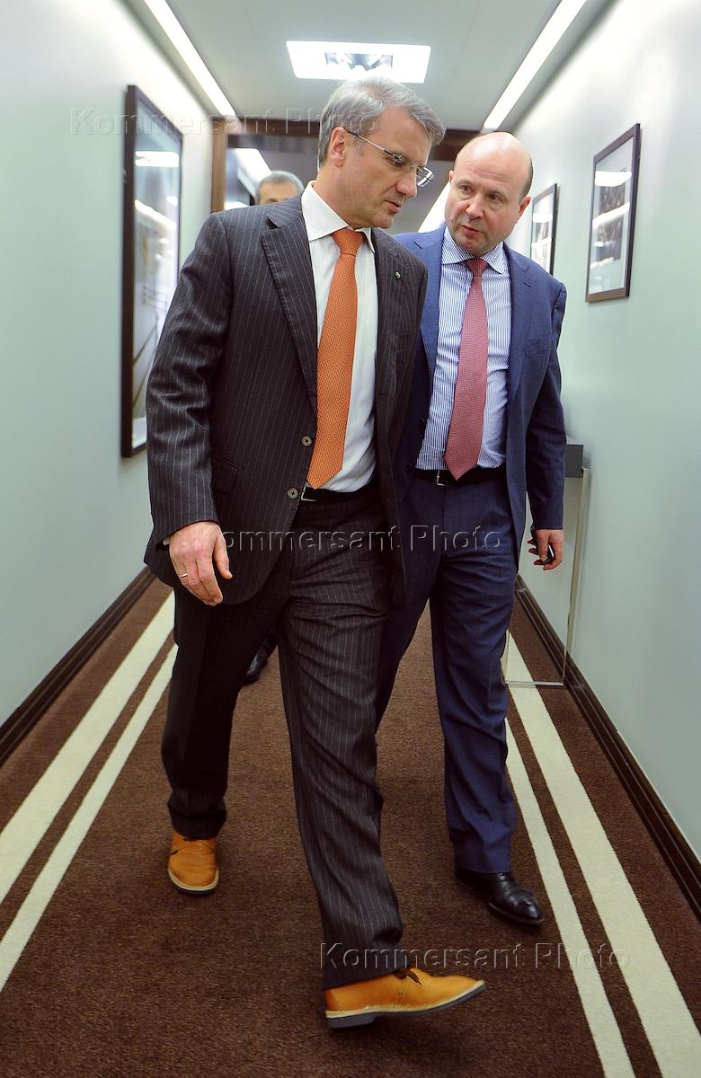 Президент, председатель Правления Сбербанка Герман Греф (слева) после брифинга по итогам заседания Наблюдательного совета Сбербанка России. Брифинг прошел в здании Сбербанка России.