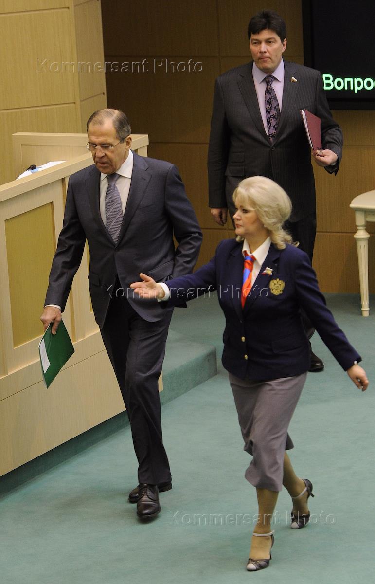 Заседание Совета Федерации России. Слева направо: первый заместитель председателя Совета Федерации России Александр Торшин, министр иностранных дел России Сергей Лавров и председатель Совета Федерации России Валентина Матвиенко на заседании.