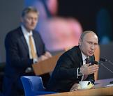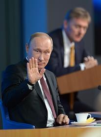 Президент России Владимир Путин (справа) и его пресс-секретарь Дмитрий Песков (слева) во время ежегодной пресс-конференции Владимира Путина в Центре международной торговли на Красной Пресне .