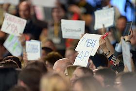 Пресс-конференция президента России Владимира Путина для российских и иностранных журналистов прошла в Центре международной торговли (ЦМТ). Плакат "Очень важный вопрос!".