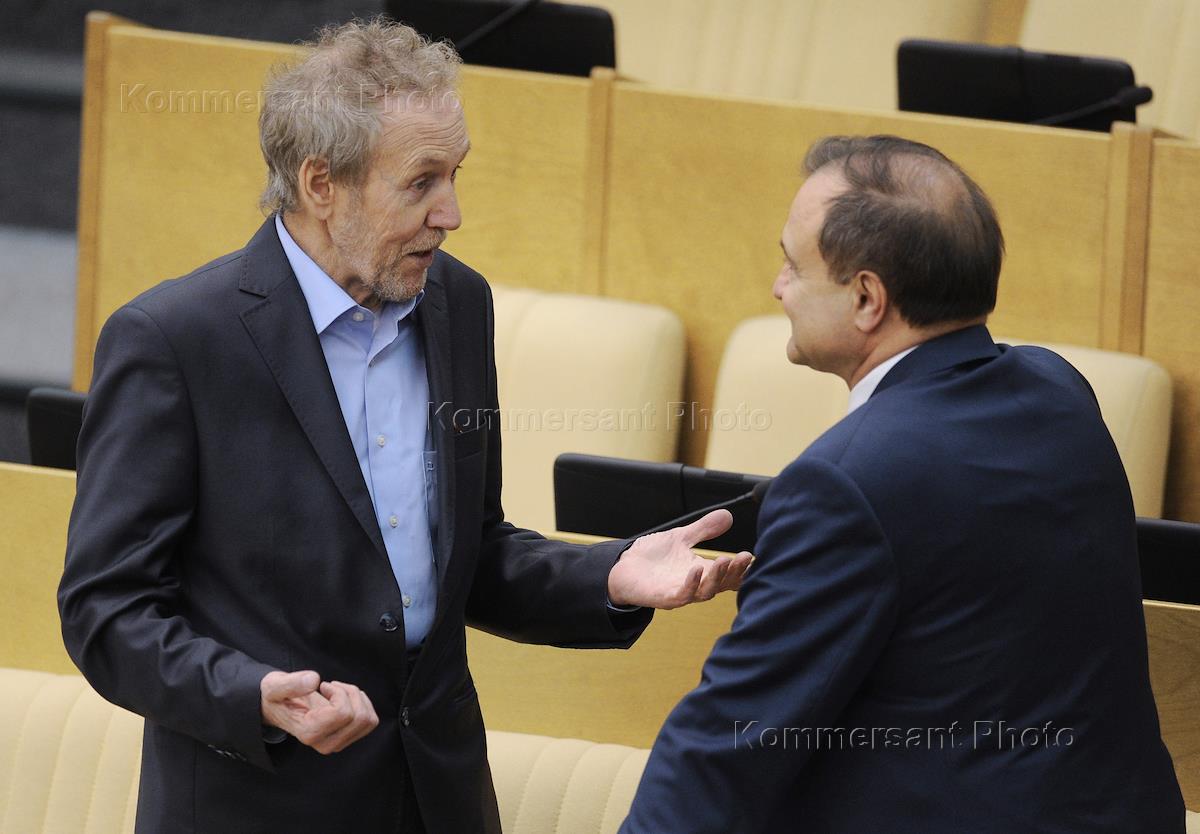 Заместитель председателя комитета Государственной думы (ГД) России по конституционному законодательству и государственному строительству Дмитрий Вяткин (в центре) и заместитель председателя комитета ГД по региональной политике и проблемам Севера и Дальнего Востока Ростислав Гольдштейн (справа) во время заседания Госдумы.