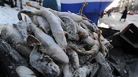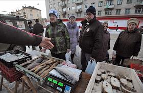 Виды города Надвоицы. Уличная торговля домашней колбасой и салом на предновогодней ярмарке.
