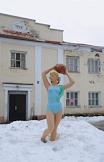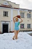 Виды города Надвоицы. Скульптура спортсменки с мячом у здания детско-юношеской спортивной школы.