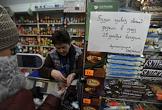 Жанровая фотография. Магази по торговле хозяйственными товарами. Объявление на входной двери "Просьба к людям ожидающих автобуса, не устраивайте столпотворение в магазине. Магазин это не место для ожидания автобуса!".
