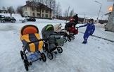 Виды города Надвоицы. Мамы с детскими колясками во дворе жилого дома во время прогулки.