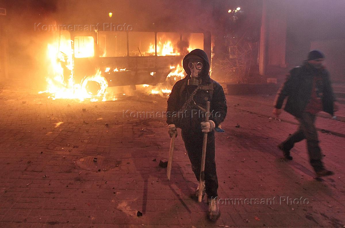 Евромайдан. Беспорядки на улице Грушевского. Столкновения между сторонниками оппозиции и сотрудниками правоохранительных органов произошли при попытке митингующих прорваться к зданиям правительства и парламента Украины. Сгоревший милицейский автобус.