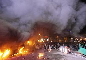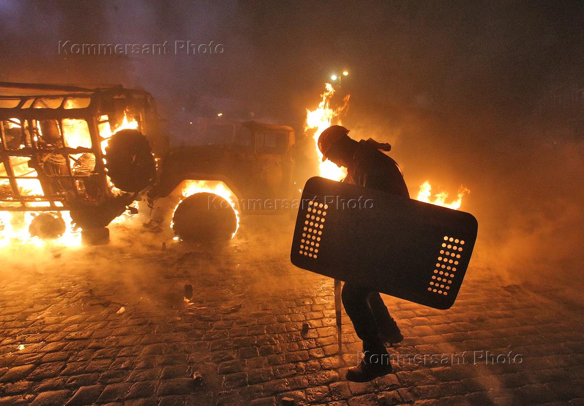Горящий автобус во время беспорядков возле стадиона "Динамо". Столкновения между сторонниками оппозиции и сотрудниками правоохранительных органов произошли при попытке митингующих прорваться к зданиям правительства и парламента Украины.