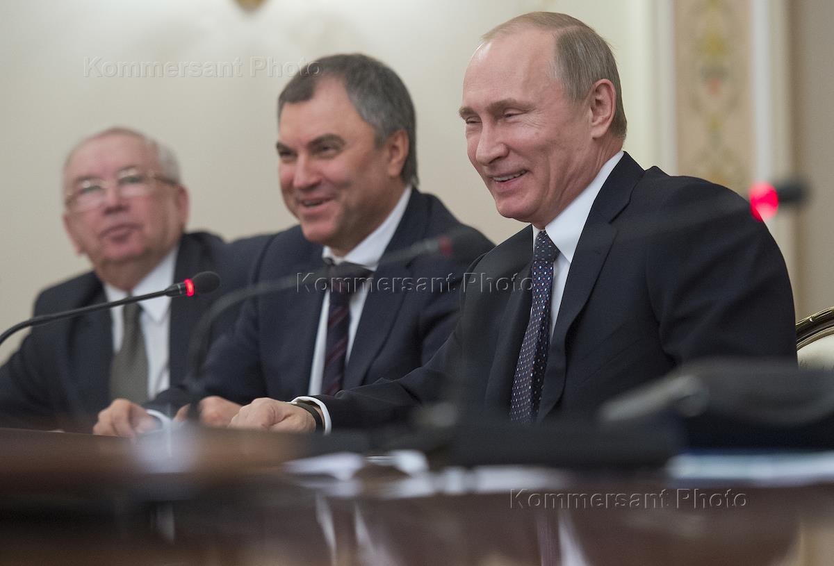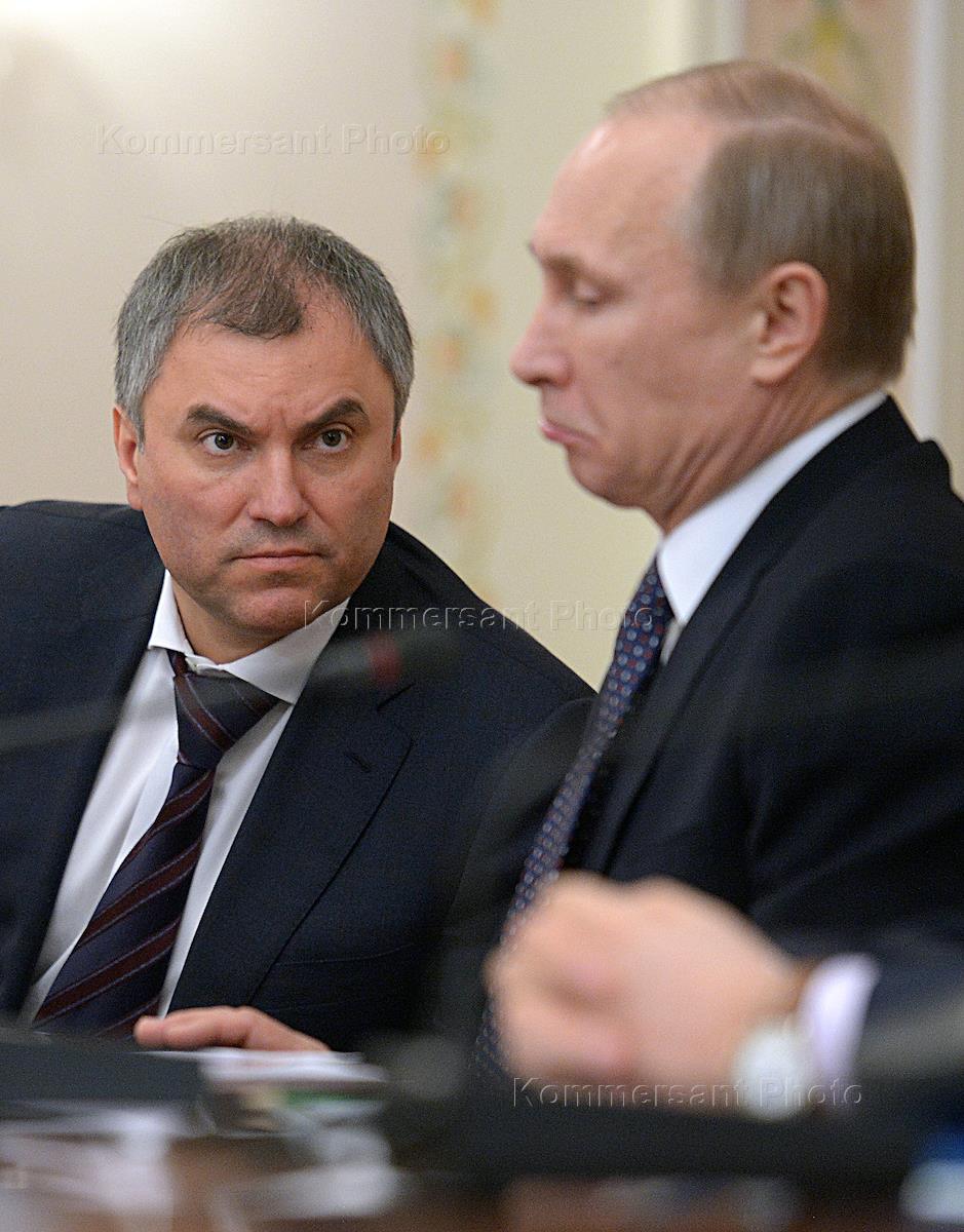 Первый заместитель руководителя администрации президента России Вячеслав Володин (слева) и президент России Владимир Путин (справа) во время заседания президиума совета при президенте России по развитию гражданского общества и правам человека. Заседание прошло в Малом зале администрации президента.