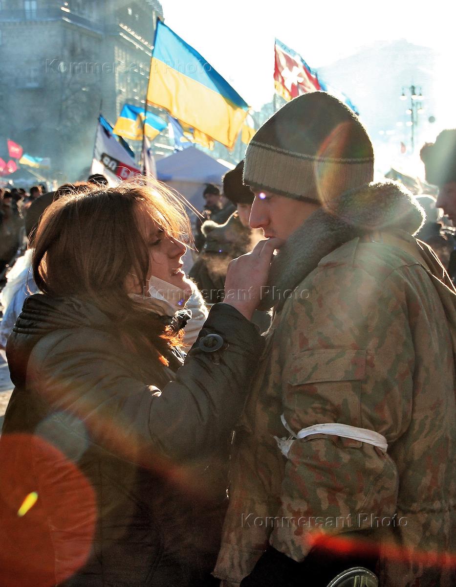 Евромайдан. Беспорядки в Киеве. Майдан Незалежности (площадь Независимости). Молодая пара защитиков Майдана.