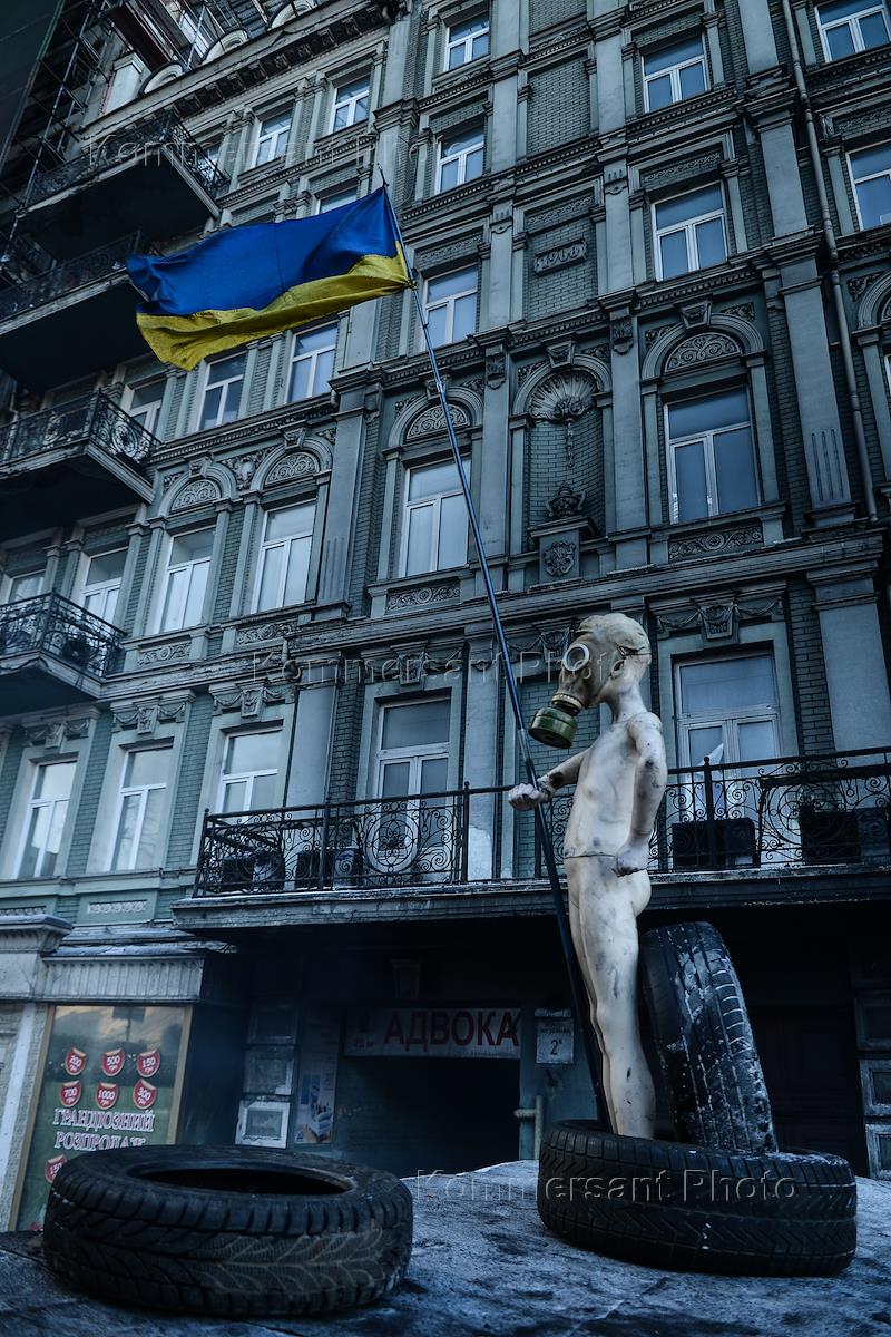 Евромайдан. Беспорядки в Киеве. Скульптура мальчика в противогазе и с флагом ЕС.