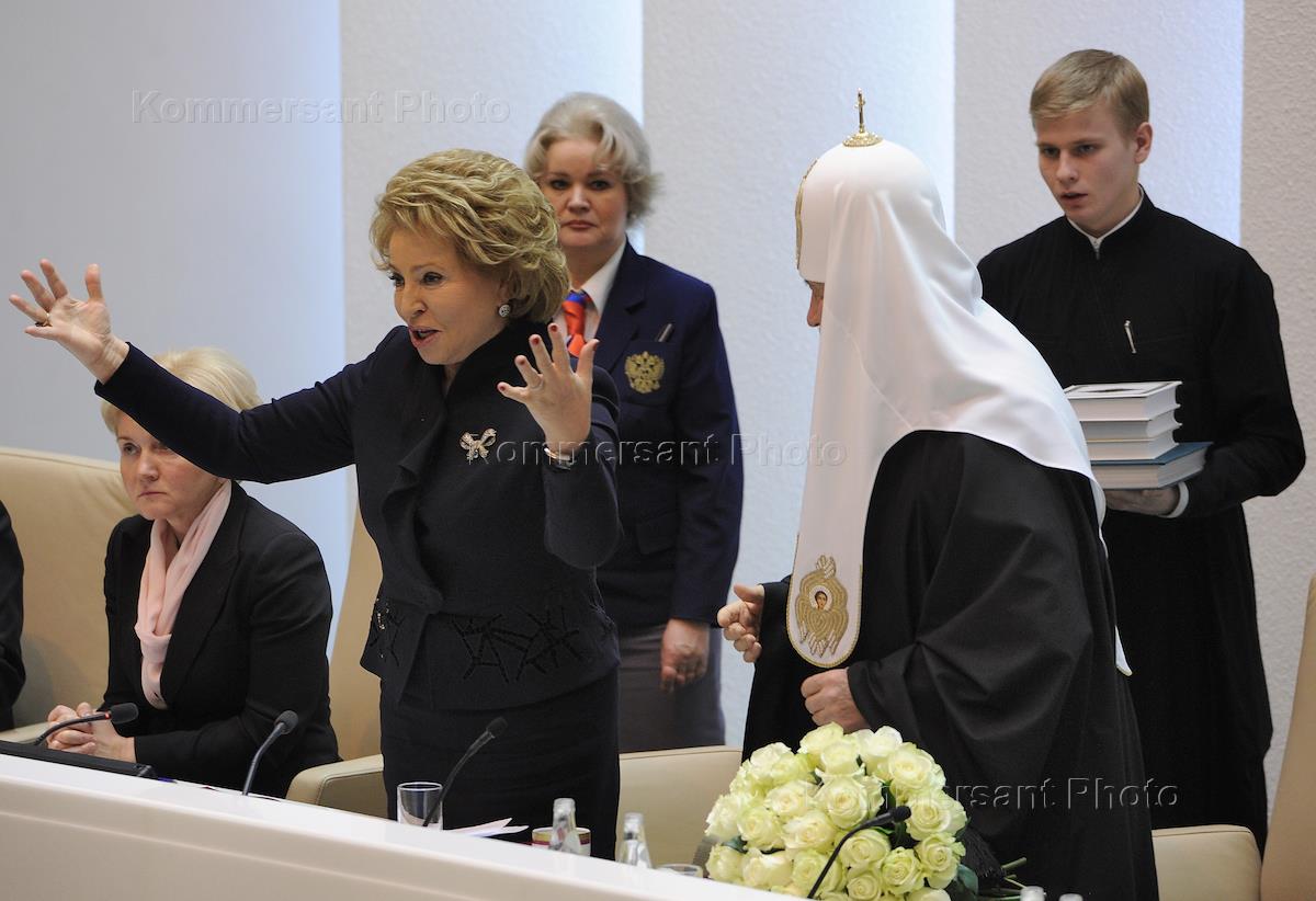Первое заседание Рождественских парламентских встреч на тему: "Исторический опыт и современные тенденции развития партнерских взаимоотношений церкви, власти и общества. Семья как основа национальной безопасности государства". Председатель Совета Федерации России Валентина Матвиенко (слева) и Патриарха Московского и Всея Руси Кирилл (справа) во время заседания в Совете Федерации России.