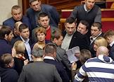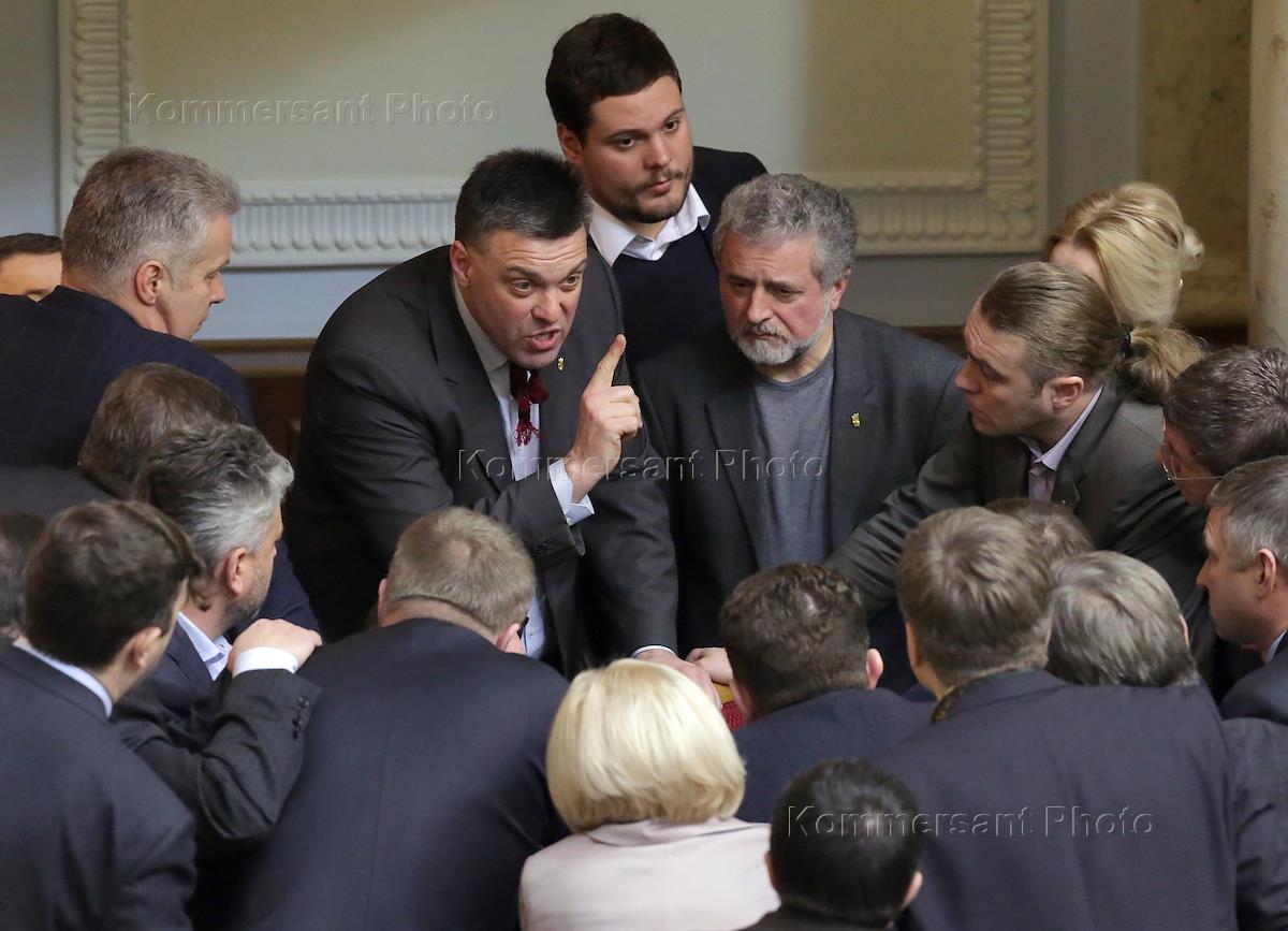 Внеочередное заседание Верховной рады Украины (ВРУ). Народный депутат ВРУ VII созыва, руководитель фракции ВРУ "ВО "Свобода" Олег Тягнибок (второй слева) во время заседания.