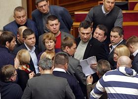Внеочередное заседание Верховной рады Украины (ВРУ). Народный депутат ВРУ VII созыва, лидер фракции Политической партии "УДАР (Украинский Демократический Альянс за Реформы) Виталия Кличко" Виталий Кличко (в центре) во время заседания.