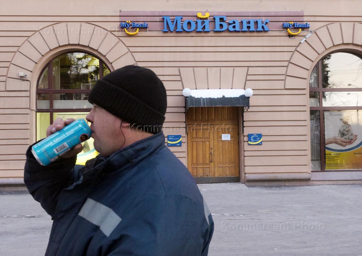 Посетитель у входа в офис банка "Мой банк" на Комсомольском проспекте. На двери объявление "Центральный Банк России с 31 января 2014 года отозвал лицензию у кредитной организации "Мой Банк" (ООО)".