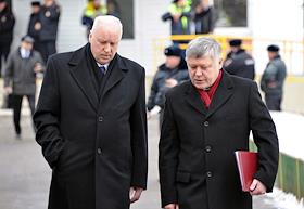 Председатель Следственного комитета России, генерал-полковник юстиции Александр Бастрыкин (в центре) и его заместитель Василий Пискарев (справа) возле московской школы № 263, куда проник вооруженный старшеклассник - учащийся школы.