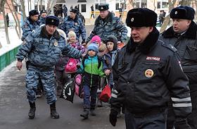 Сотрудники полиции выводят детей из московской школы № 263, куда проник вооруженный старшеклассник - учащийся школы.
