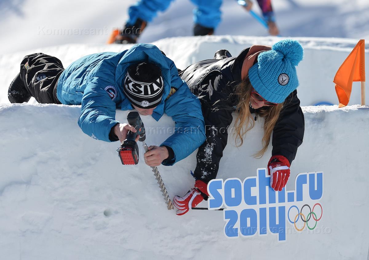 XXII Зимние Олимпийскихе игры в Сочи. Подготовка трассы перед квалификационными заездами по слоупстайлу на соревнованиях по сноуборду среди женщин в Горнолыжном центре "Роза Хутор".