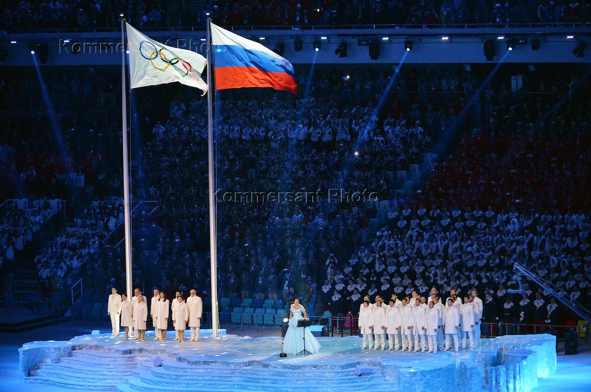 XXII зимние Олимпийские игр в Сочи. Церемония открытия прошла на стадионе "Фишт". Оперная певица Анна Нетребко (в центре) во время исполнения олимпийского гимна.