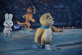 XXII зимние Олимпийские игр в Сочи. Церемония открытия прошла на стадионе "Фишт". Талисманы олимпиады в Сочи - заяц, белый медведь, леопард.