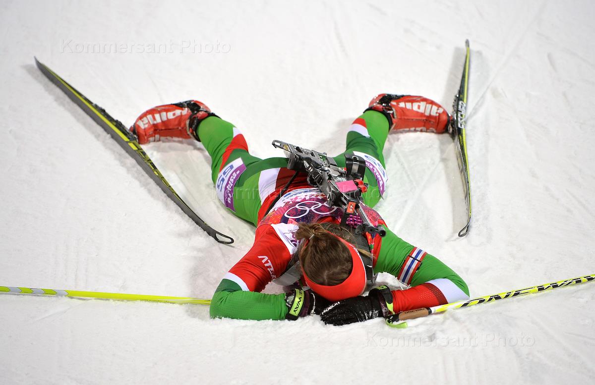 XXII Зимние Олимпийские игры в Сочи. Биатлон. Спринт на 7,5 км среди женщин. Член олимпийской сборной команды Беларуси Дарья Домрачева на соревнованиях в комплексе "Лаура".
