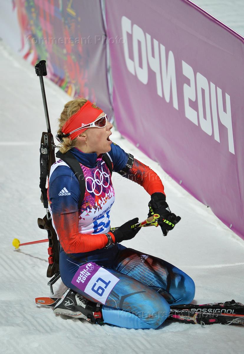 XXII Зимние Олимпийские игры в Сочи. Биатлон. Спринт на 7,5 км среди женщин. Член олимпийской сборной команды России по биатлону Ольга Зайцева на соревнованиях в комплексе "Лаура".