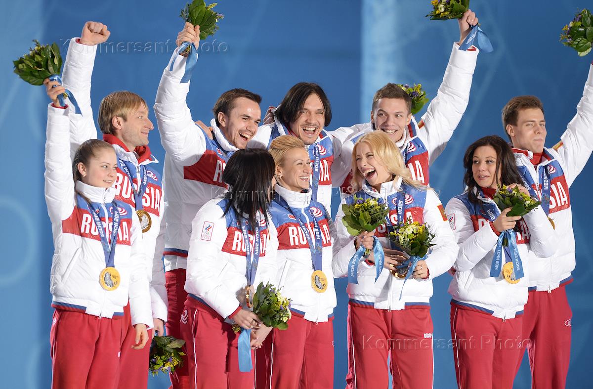XXII Зимние Олимпийские игры в Сочи. Члены олимпийской сборной команды России по фигурному катанию, завоевавшие золотые медали в командных соревнованиях по фигурному катанию, во время медальной церемонии.