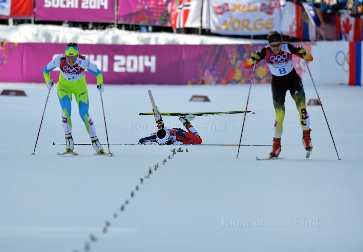 XXII зимние Олимпийские игры в Сочи. Лыжные гонки. Женщины. Спринт. Слева направо: члены сборной команды Норвегии по лыжным гонкам Ингвильд Флугстад Эстберг, Майкен Касперсен Фалла и члены сборной команды Словении по лыжным гонкам Весна Фабьян на финише.