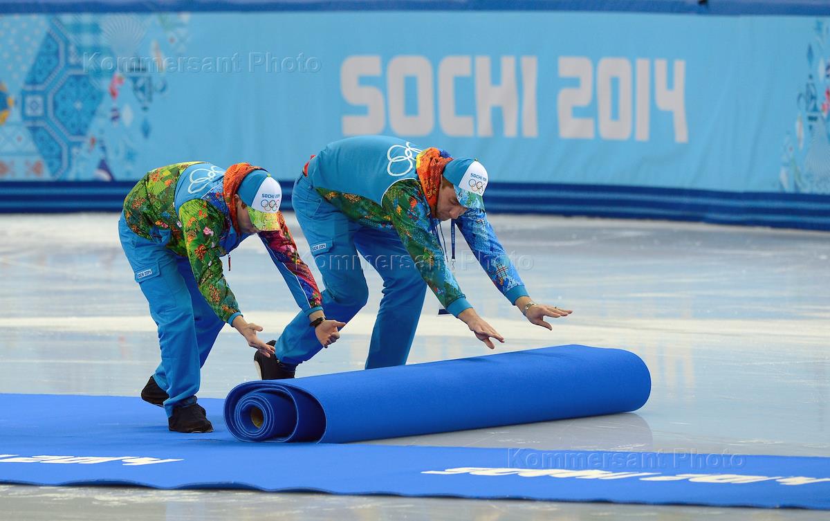 XXII Olympic Winter Games in Sochi. Volunteers before the competition on the ice.