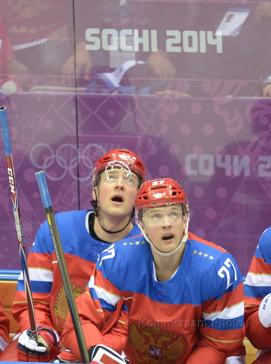 XXII Зимние Олимпийские игры в Сочи. Матч группового этапа между сборными командами России и Словении на соревнованиях по хоккею среди мужчин. Игроки сборной России Илья Никулин (слева) и Алексей Терещенко (справа) во время матча.