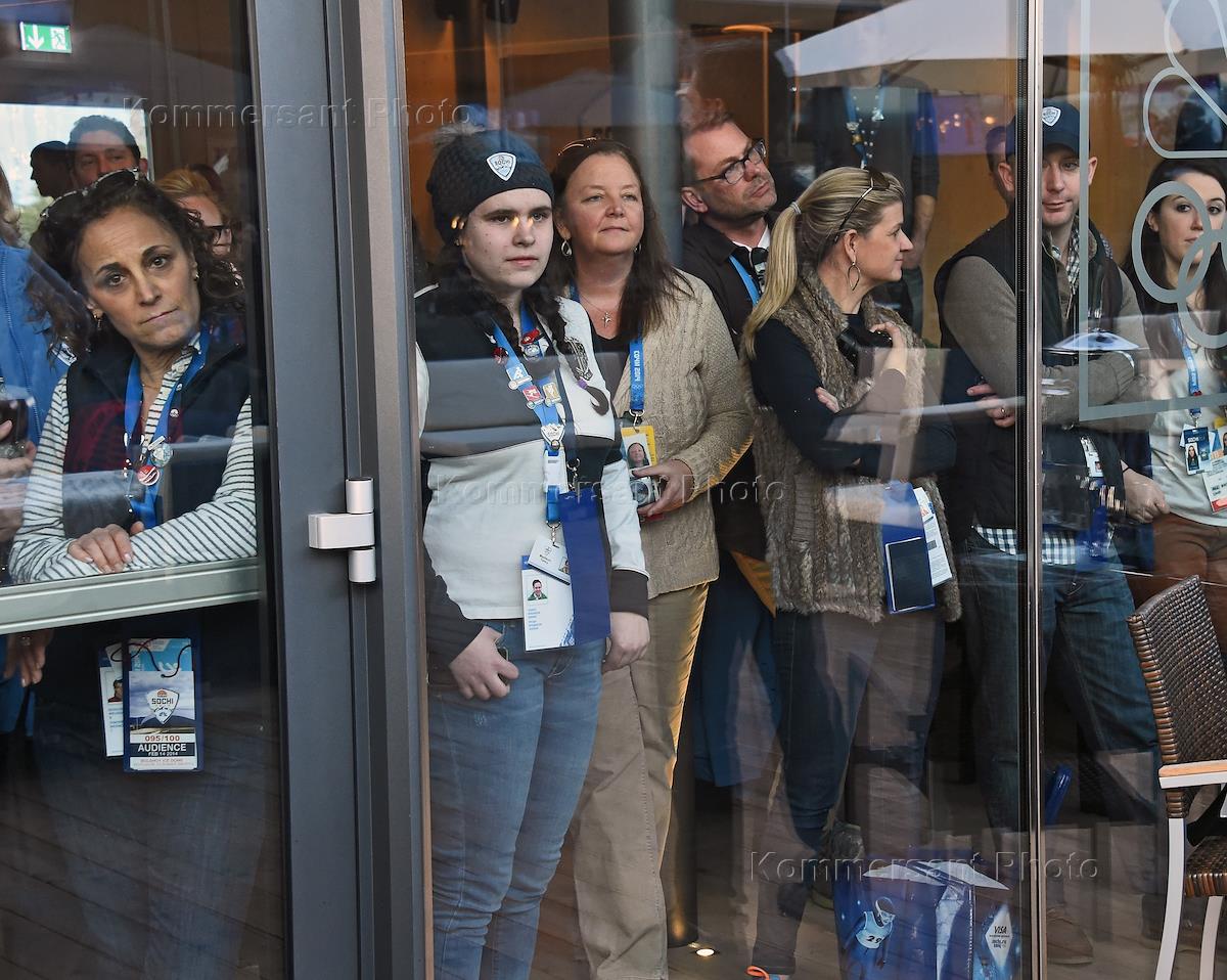 XXII Зимние Олимпийские игры в Сочи. Болельщики США за стеклянной дверью наблюдают за президентом России Владимиром Путиным, который посетил Дом болельщиков олимпийской команды США в Олимпийском парке.