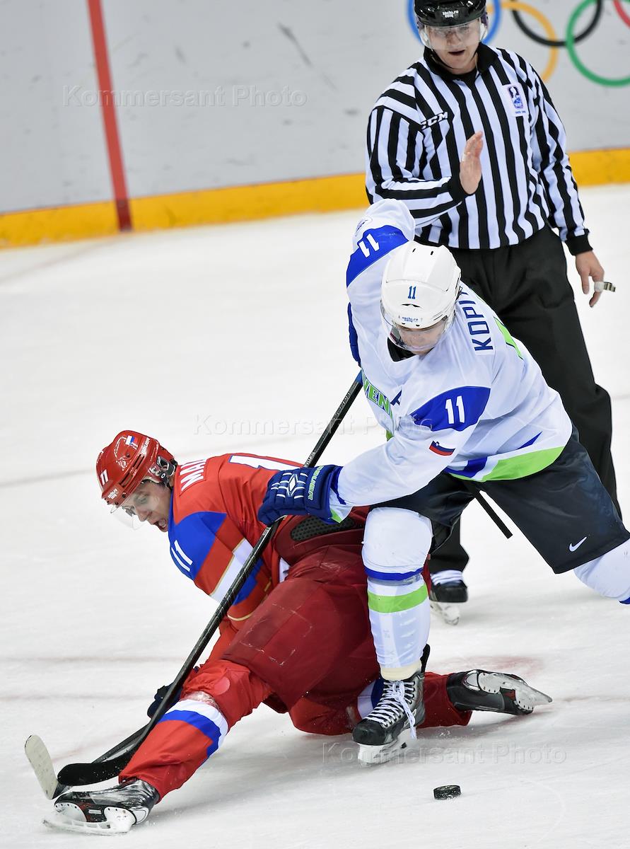 XXII Olympic Winter Games in Sochi. Hockey match between the national teams of Russia and Slovenia was held at the Ice Palace "Bolshoy" (13.02). Member team of Russia Alexander Radulov (center) and Slovenia team member Andrey Tavzhel (right) during the match.