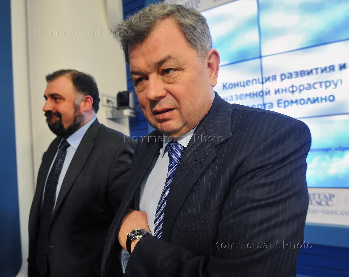 Генеральный директор авиакомпании "ЮТэйр" (UTair Aviation) Андрей Мартиросов (слева) и губернатор Калужской области Анатолий Артамонов (слева) во время пресс-конференции на тему "Международный аэропорт Ермолино: планы развития". Пресс-конференция прошла в агентстве ИТАР-ТАСС.